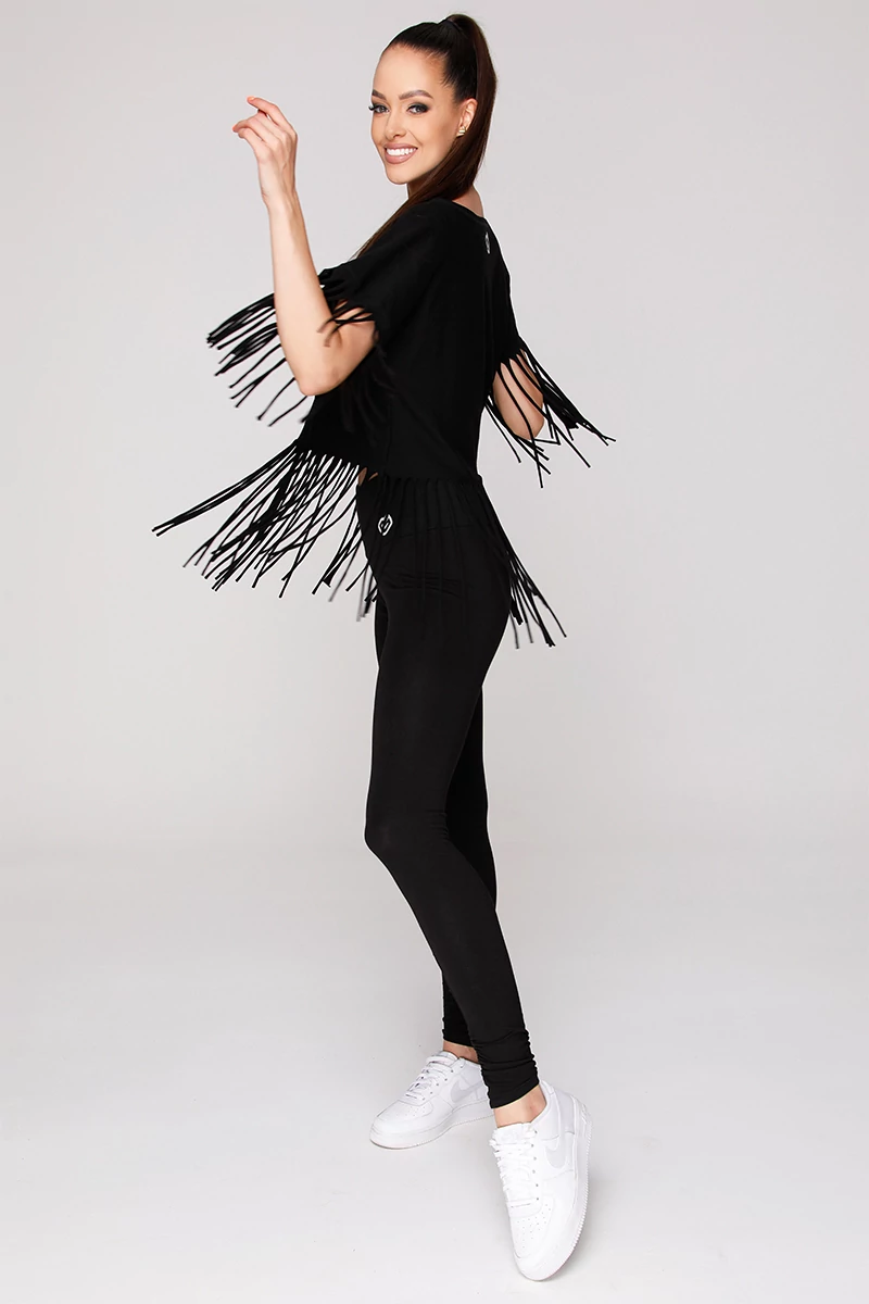 A szett két részből áll: 1, Bő fazonú női póló, saját anyagával rojtozott ujja és alja megoldással. Bő, vállra leeső nyakkivágással. 2, Nadrágunk: Magasított derekú leggings, lábszárán húzott, lapos varrással készített, elején logó díszítéssel. A modell 180cm és S méretű ruhaméretet visel. Anyagösszetétel mindkét esetében: 95% pamut + 5% spandex Tisztítás: Kifordítva, kímélő mosással, legfeljebb 30 fokon! Mintát tilos vasalni! Áztatni tilos! |