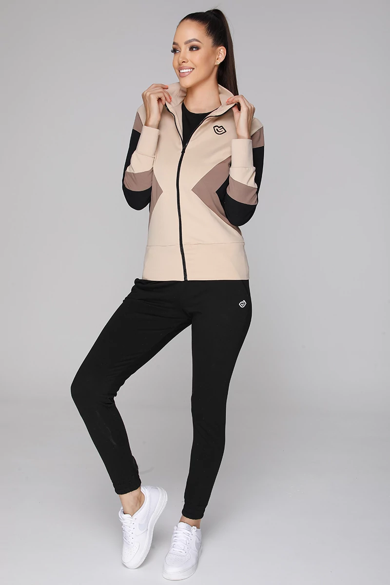 1, Felső: Szűk fazonú, saját anyagával kombinált, cippzáros joggingfelső, magas passzés nyakkal.