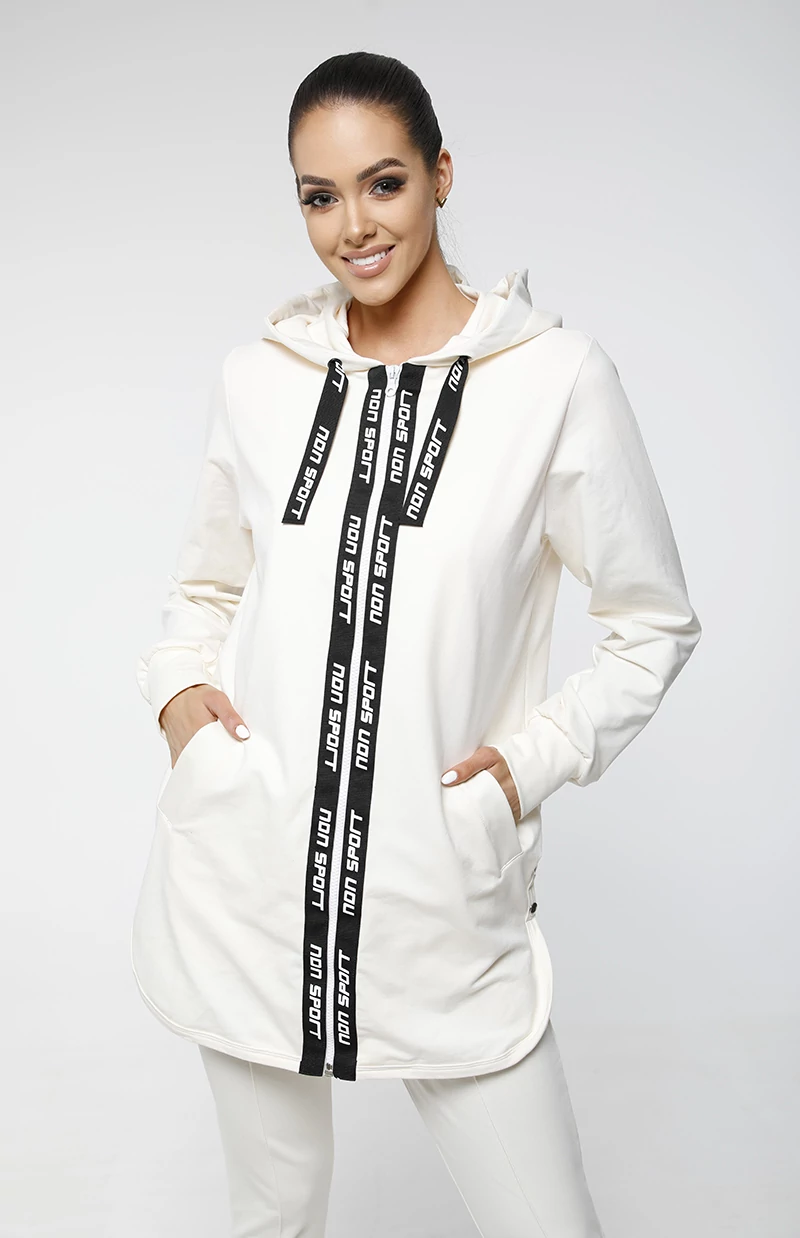 | Hosszított,elején cipzáros melegítőfelső,zsebbel, húzózsinóros kapucnival. A cipzár mellett egyedi ndn sport szalag fut végig,ami megegyezik a kapucniba tett szalaggal. Vajszínben. | |
