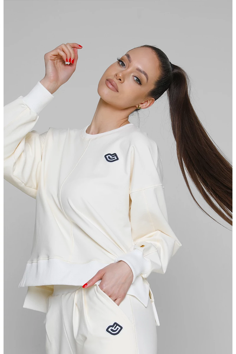 Hosszú ujjú, kerek nyakú, bő fazonú, hímzett logó felvarróval díszített pulóver.