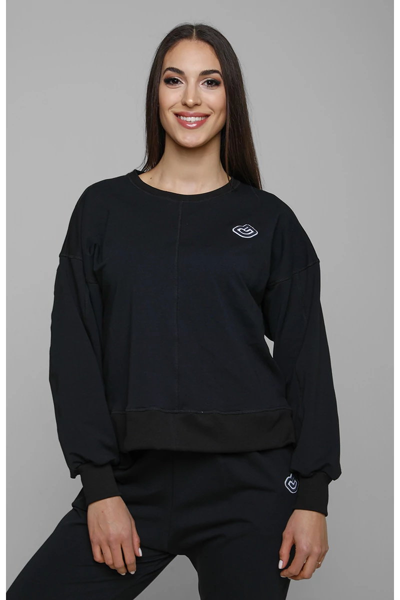 Hosszú ujjú, kerek nyakú, bő fazonú, hímzett logó felvarróval díszített pulóver.