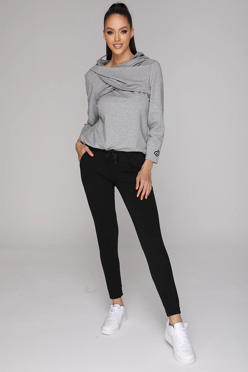 1, Bő fazonú, női, kapucnis felső, elején saját anyagából, szabott, átlapolt díszítéssel. A pulóver alja zsinórral szűkíthető, ujját kicsi logó díszíti.