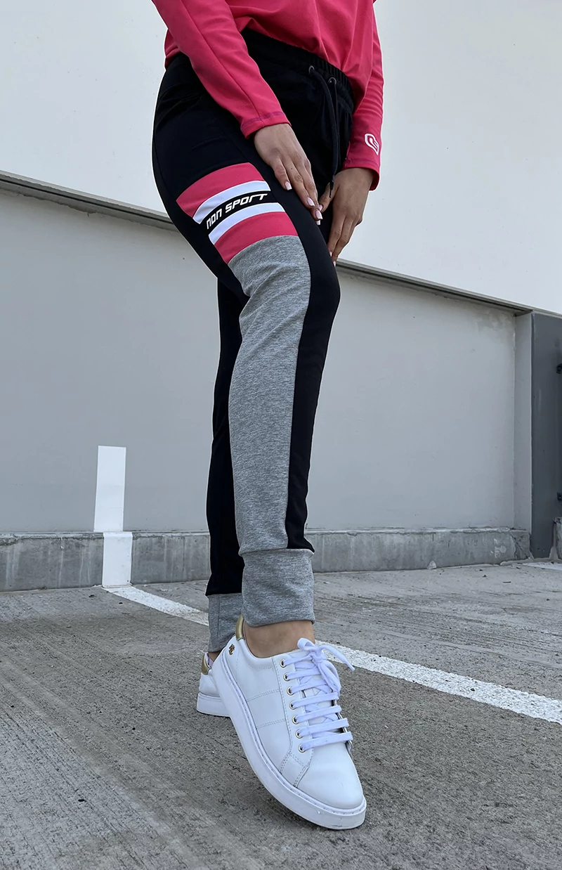 Enyhén magasított derekú, szűk fazonú, nő jogging nadrág, saját anyagából színkombinált, logózva.