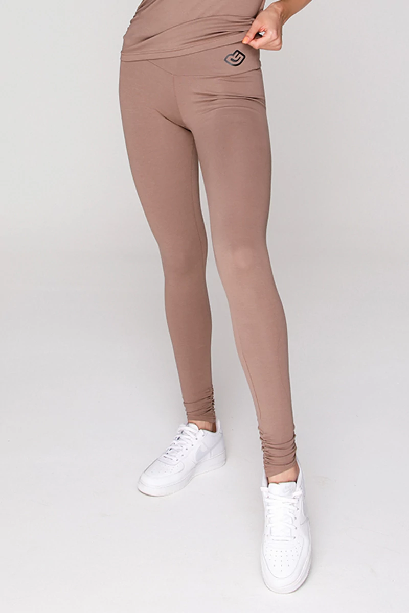 Magasított derekú leggings, lábszárán húzott, lapos varrással készített, elején logó díszítéssel.