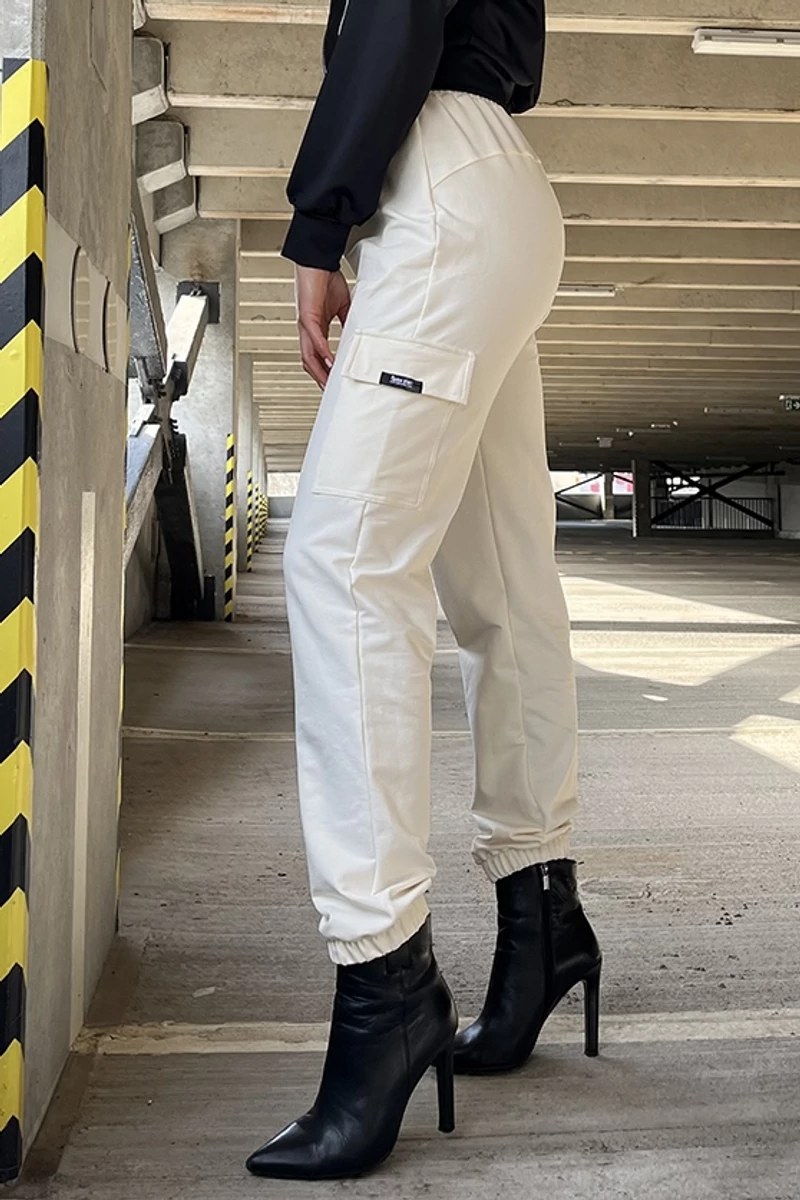Női oldalzsebes vajszínű melegítőnadrág, magasított,gumis derekkal, gumis alja passzéval. A hétköznapokba beilleszthető darab, ha a kényelem a fontos.