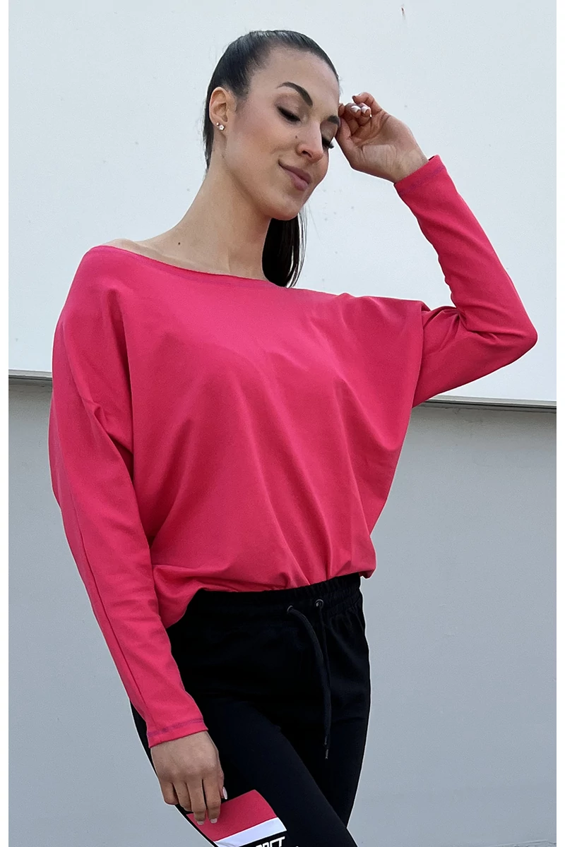 Lezser, bő fazonú női felső. Kerek, bő nyakkivágással, ujján kicsi logó nyomattal,ciklámen színben.