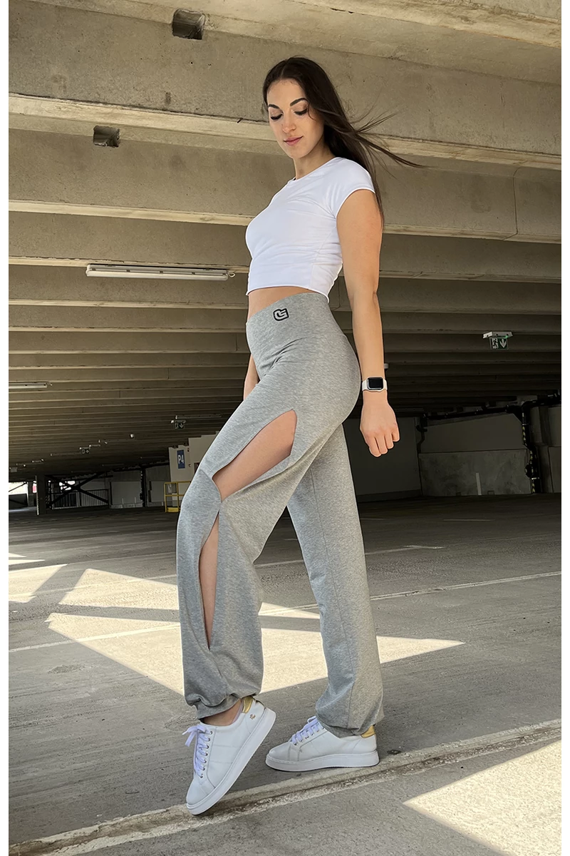 Világosszürke pamut anyagú hosszúnadrág. Oldalt sliccelt felvágásal igazán kényelmes szellős viselet. Edzésekhez vagy hétvégi programokhoz a legideálisabb viselett.