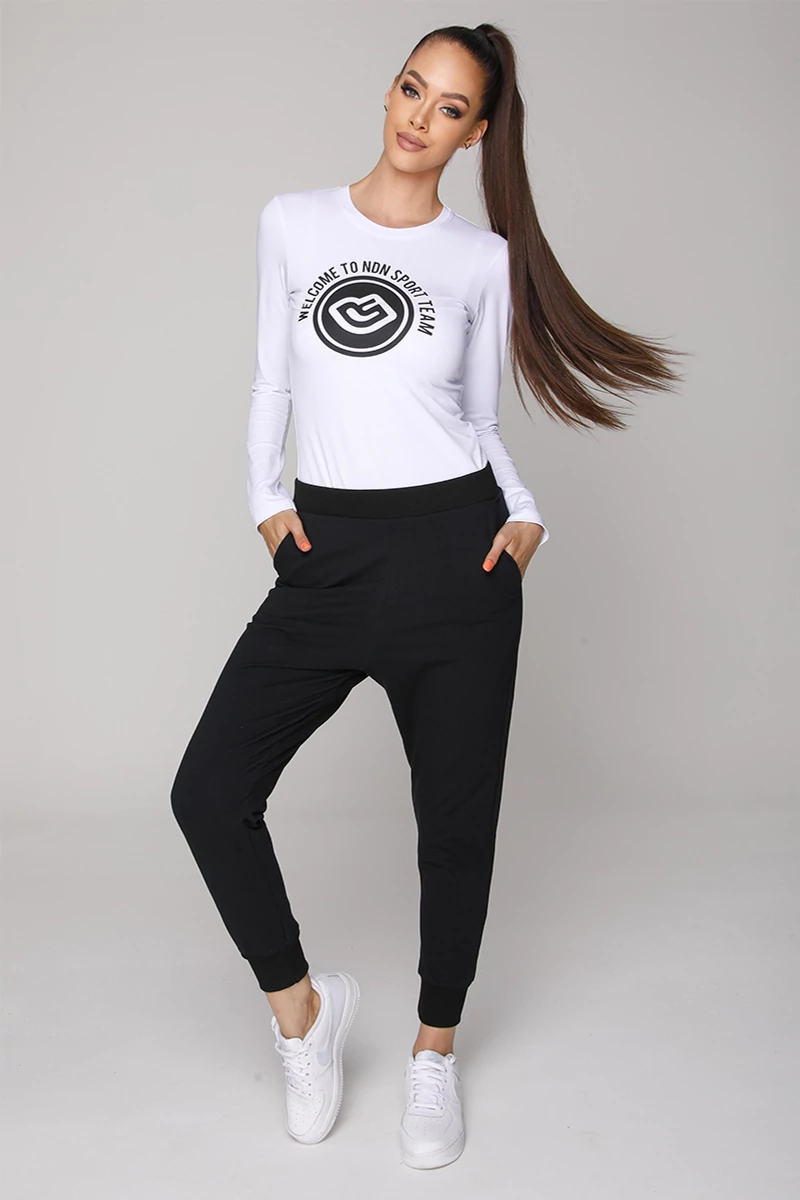 1,Felsőnk: Szűk fazonú hosszú ujjú, kerek nyakú póló. Elején kör márka logóval.