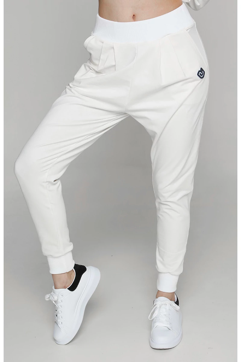 Magasított, gumis derekú, bő fazonú szabadidő nadrág, zsebbel és elején logó díszítéssel.